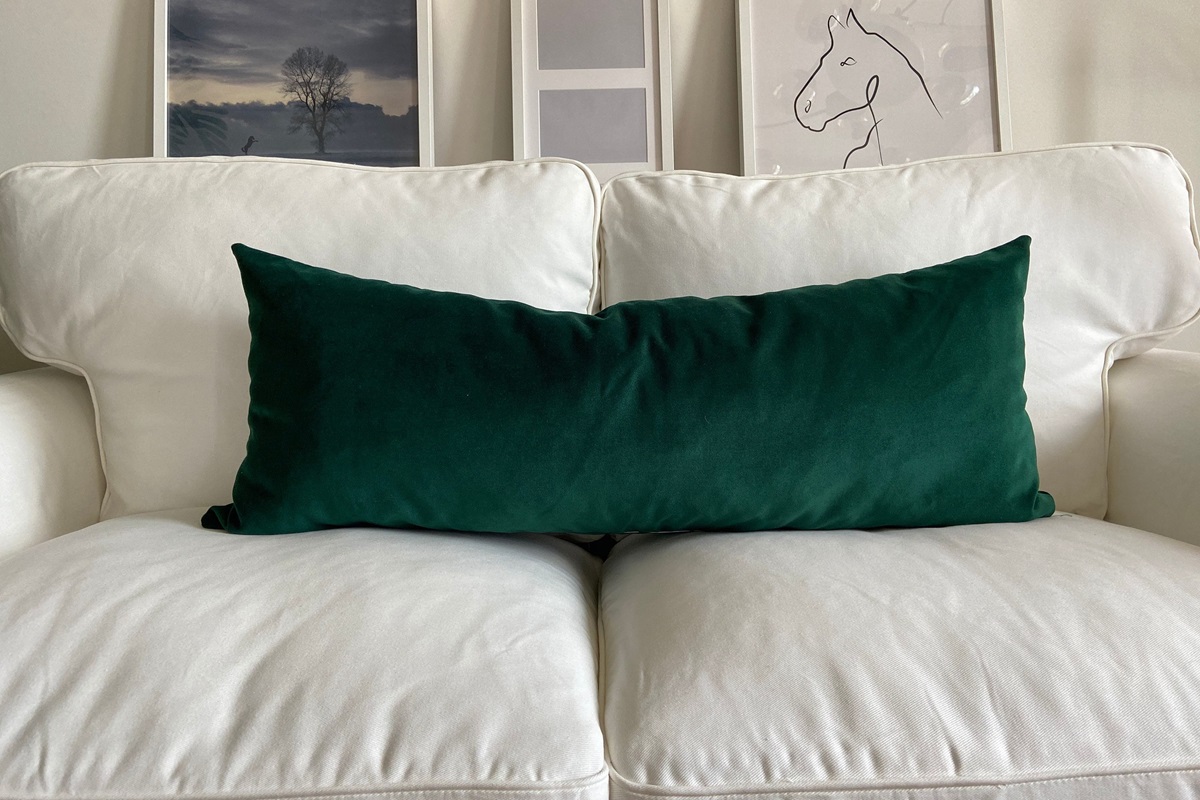De meest populaire opstelling op dit moment is één lange kussen over de hele lengte van de rugleuning (of twee grote kussens naast elkaar), of twee cilindervormige kussens aan de uiteinden, tegen de armleuningen. Dit geeft direct meer zicht en vergroot de bank visueel. Het oog wordt niet meer afgeleid door een veelheid aan details, maar glijdt over een vloeiende en harmonieuze lijn.